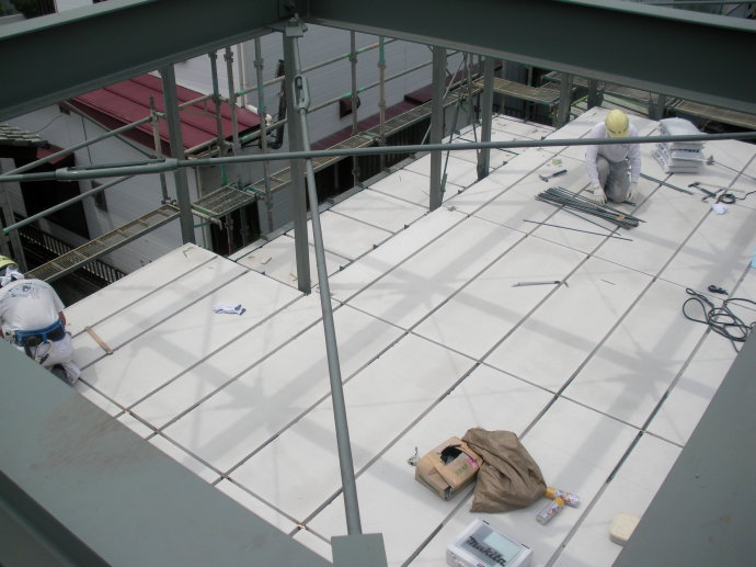 2、板吊至屋面,由人力扶正,對準(zhǔn)板位,緩慢下降,輕落在安裝位置上。